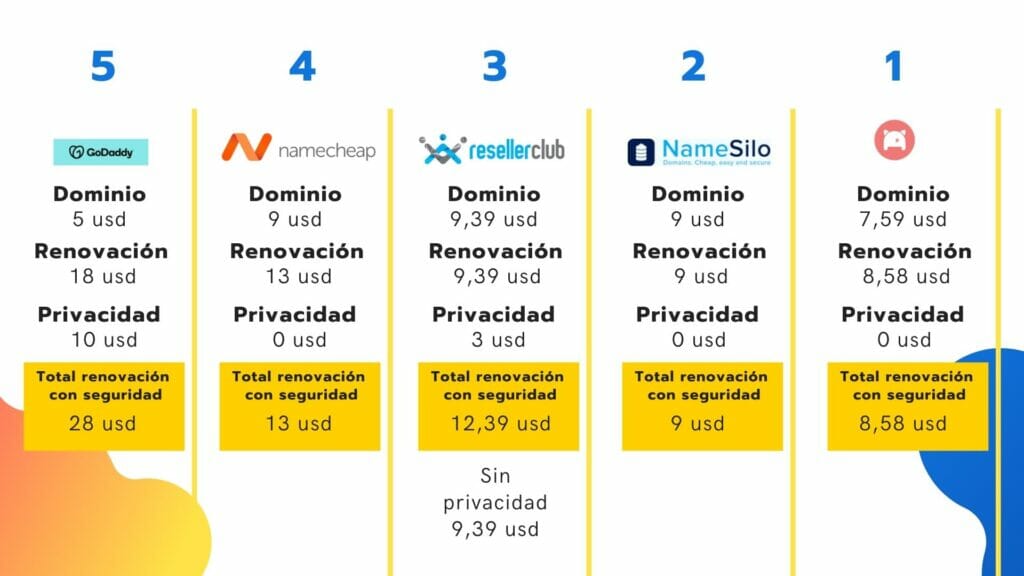 Quiero encontrar los dominios mas baratos de internet. En este top 5 te muestro las páginas con los dominios mas baratos. Vamos a tomar como ejemplo el dominio .com, vamos a ver el precio de compra y el precio de renovación que incluya el servicio de privacidad o Who is.